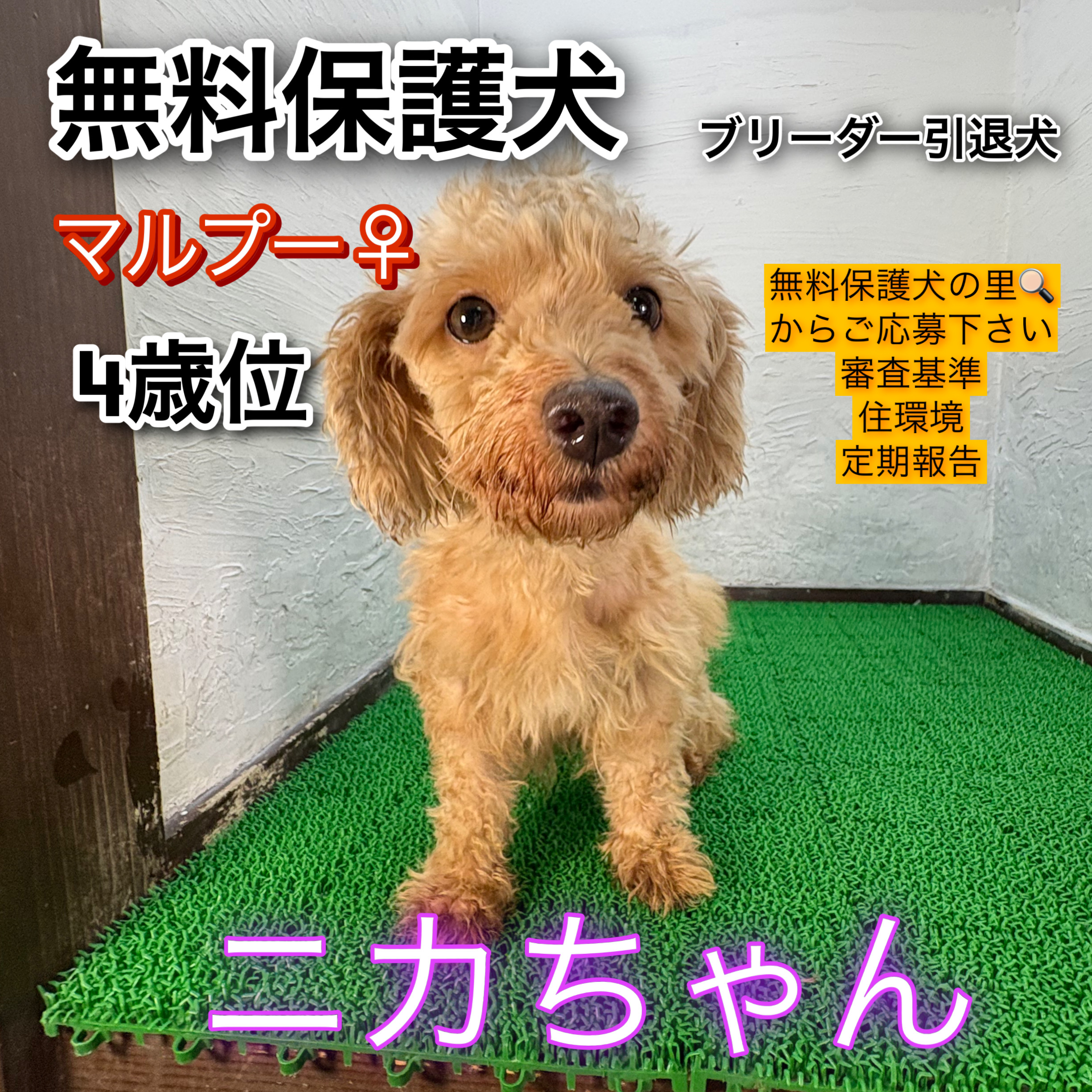 ニカちゃんは ブリーダー引退犬 として「無料保護犬の里」で保護されており、譲渡費用は無料で新しい里親様を募集しています。